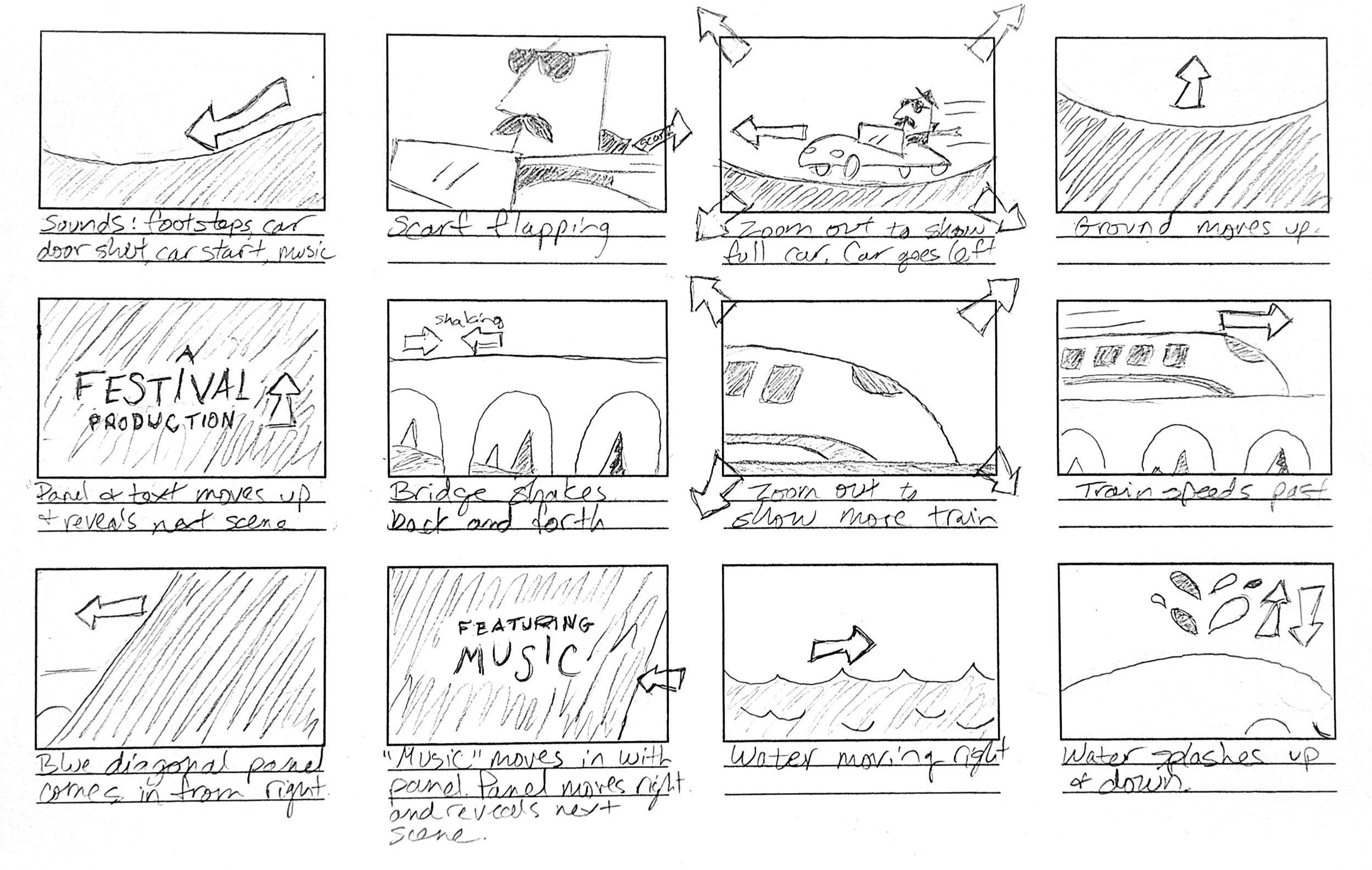 Each sequence was carefully planned using a storyboard before the vector graphics were animated. The overall sequence and motion stayed true to the storyboard. However, additional background scenery was added during the animation process to add context to the overall story.